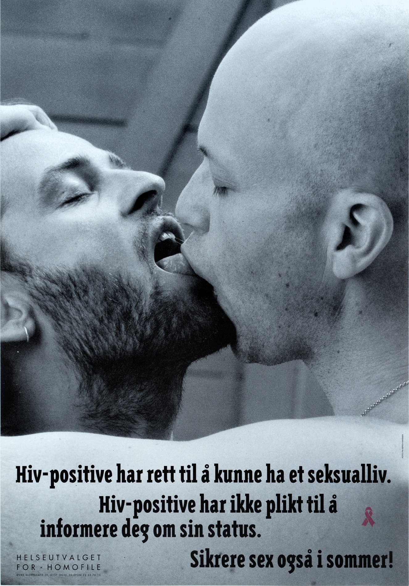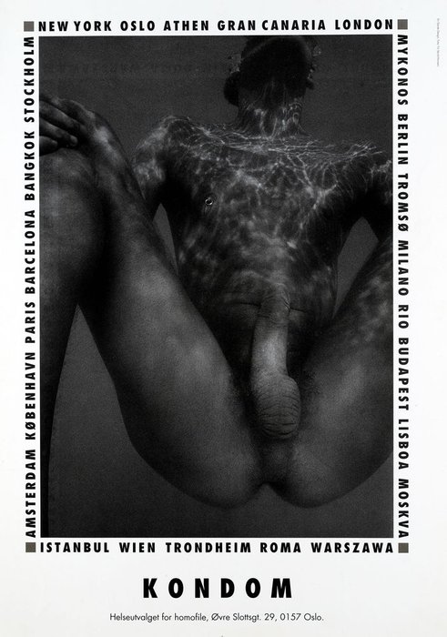 Fin Serck-Hanssen’s black and white ‘Untitled’ photograph from 1991 was later published as part of Gay and Lesbian Health Norway poster campaign series promoting safe sex. A large analog print and an original poster from the campaign with the same photograph are exhibited in Kunstnerforbundet’s windows to mark World AIDS Day 2025, accompanied by a contextualising information poster designed by Edoardo Ferrari. Gay and Lesbian Health Norway was established in 1983 to do preventive work and to promote safer sex, as in January of the same year the first AIDS patient was admitted to Rikshospitalet (Oslo University Hospital). Their poster campaign series is also part of Queer Archive and contextualised in the article The Posters Saying Safe Sex (06.03.2021).