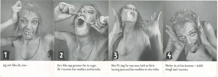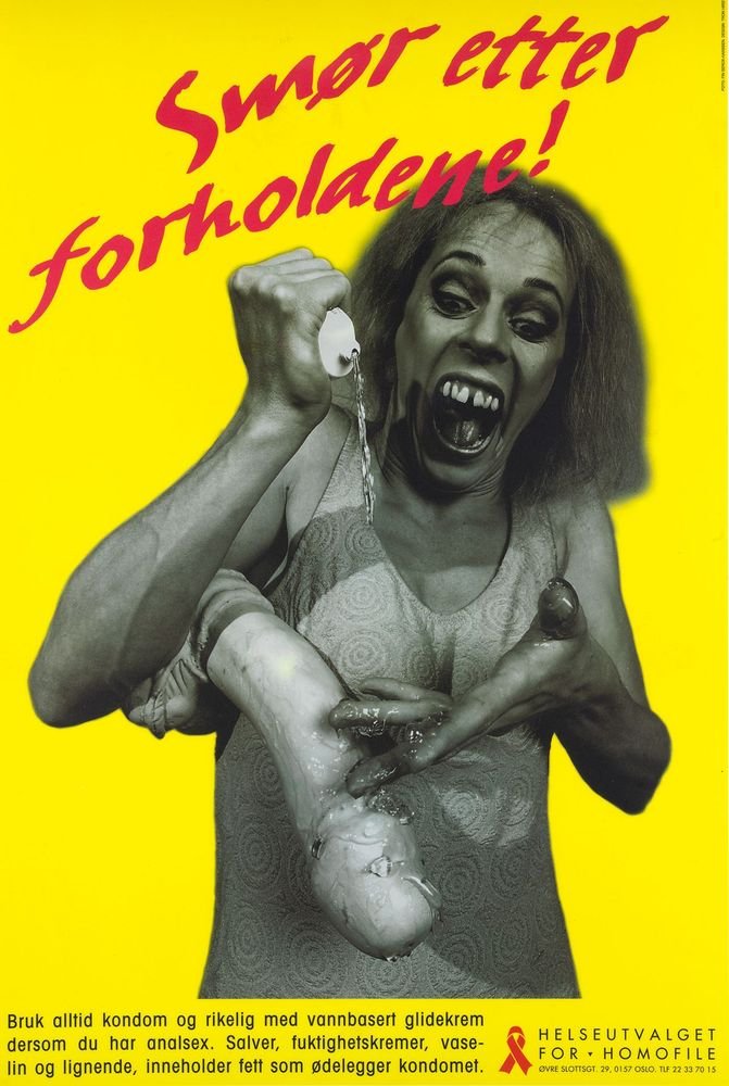 "Smør etter forholdene!" poster from Gay and Lesbian Health Norway (Helseutvalget) poster campaign series for preventive work and to promote safer sex.