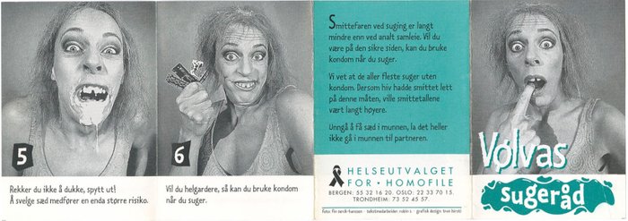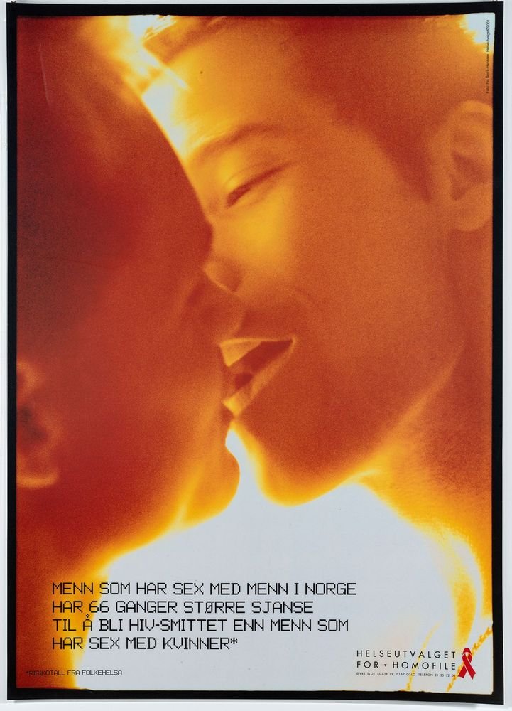 "66 ganger større sjanse..." poster from Gay and Lesbian Health Norway (Helseutvalget) poster campaign series for preventive work and to promote safer sex.