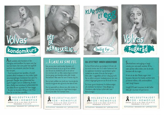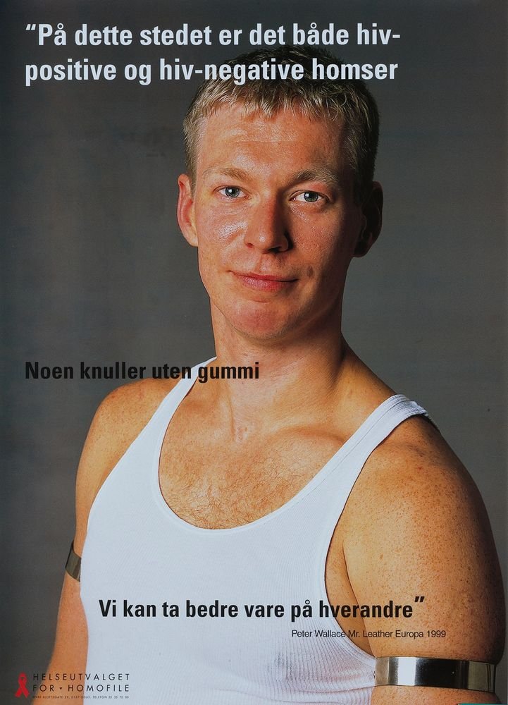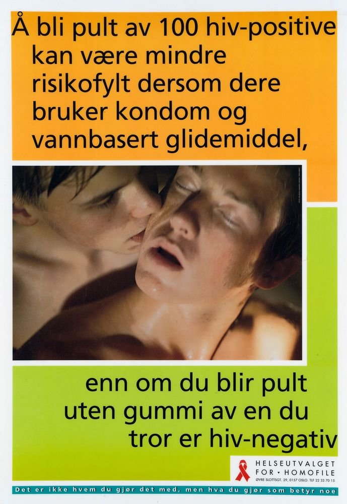 "På dette stedet er det både hiv-positive og hiv-negative homser" poster from Gay and Lesbian Health Norway (Helseutvalget) poster campaign series for preventive work and to promote safer sex.